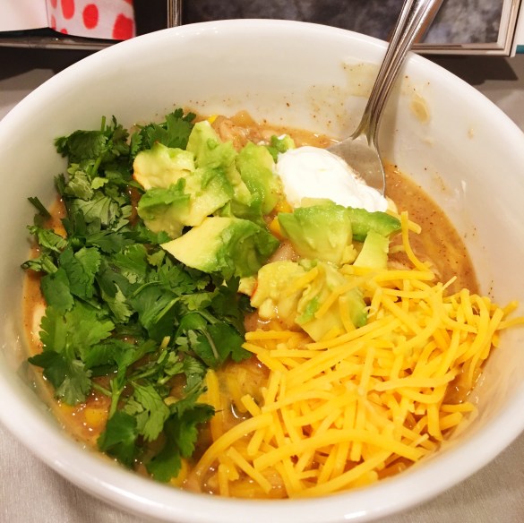 Here was my bowl topped with fresh, chopped cilantro, avocado, shredded cheese, sour cream and sliced jalapeños (not pictured).